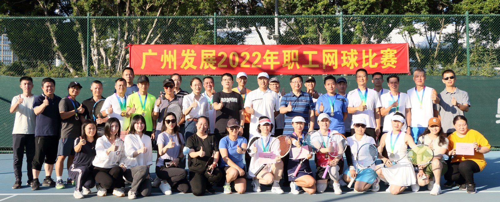 2022年10月22日,广州ag九游会登陆j9入口工会在二沙岛宏城网球场举办了2022年职工网球比赛。比赛设男子单打、男子双打、混合双打三项,共40名职工参赛,罗志刚主席全程参与活动并为获奖职工颁奖。比赛紧张激烈,参赛职工欢聚一堂、激烈角逐,比技术、拼体力、比韧劲、讲配合,奉献了一场场精彩的比赛。
